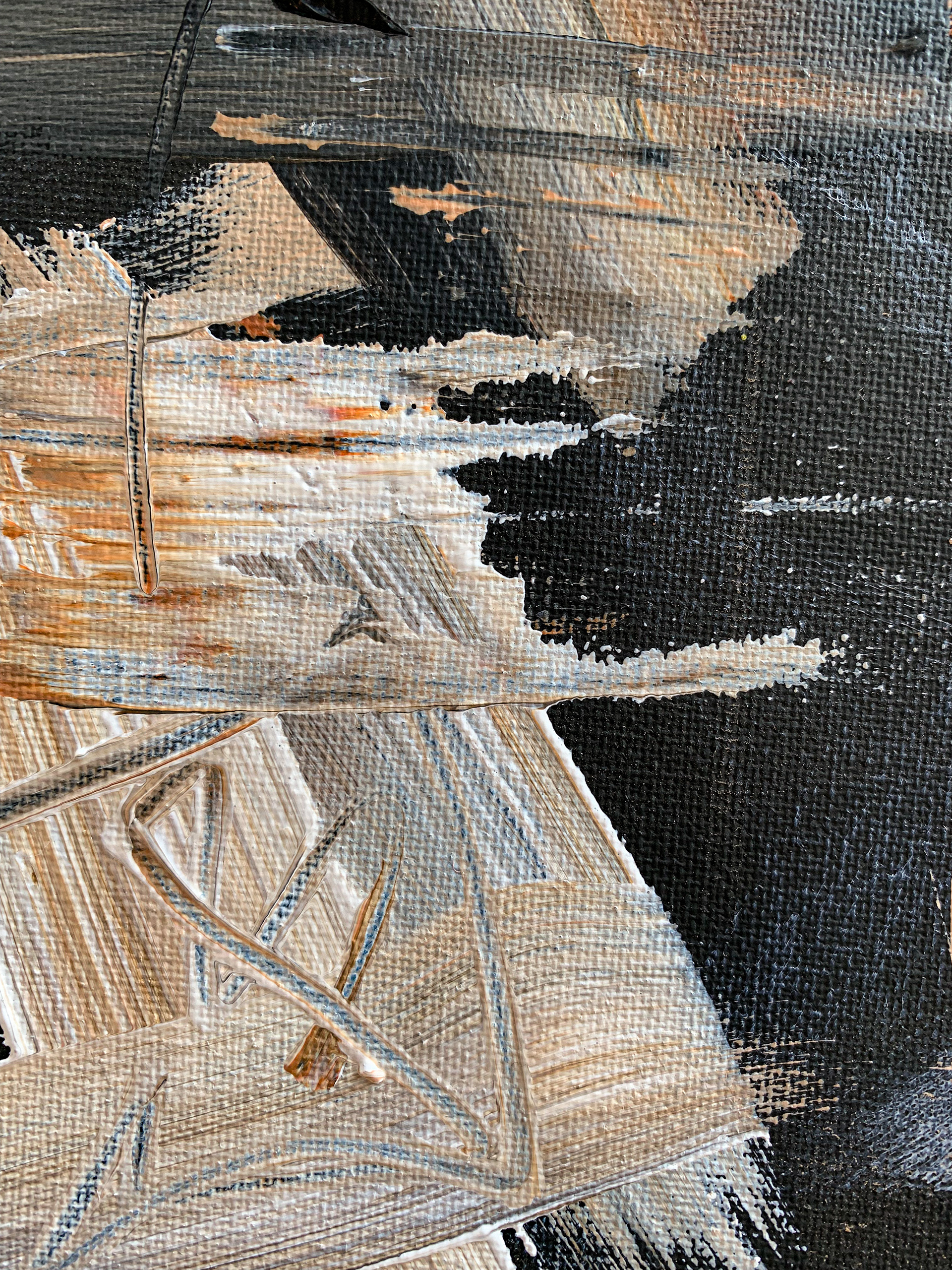 After the painting seemed well balanced I used a pan pastel to scrape away fine lines from the top layer revealing a lower layer of white paint. This made my interested to try line drawings.