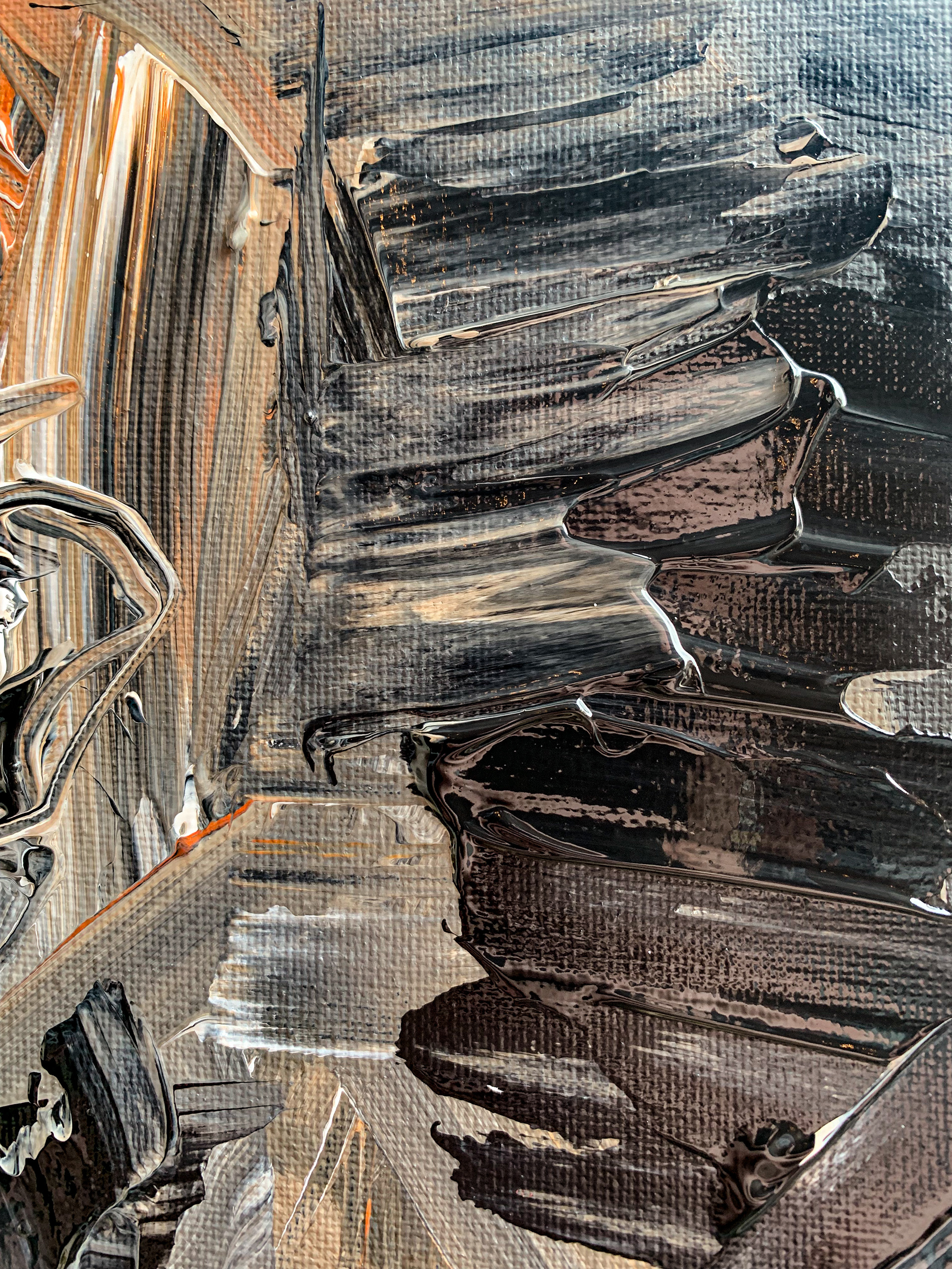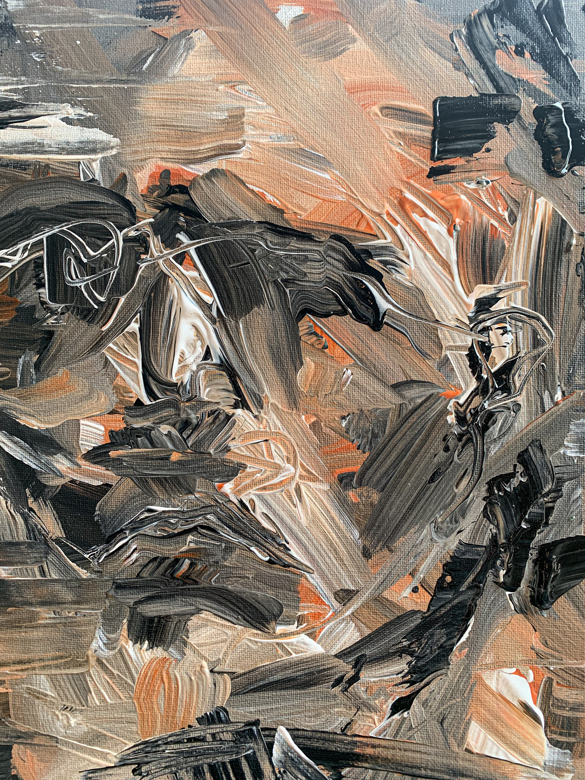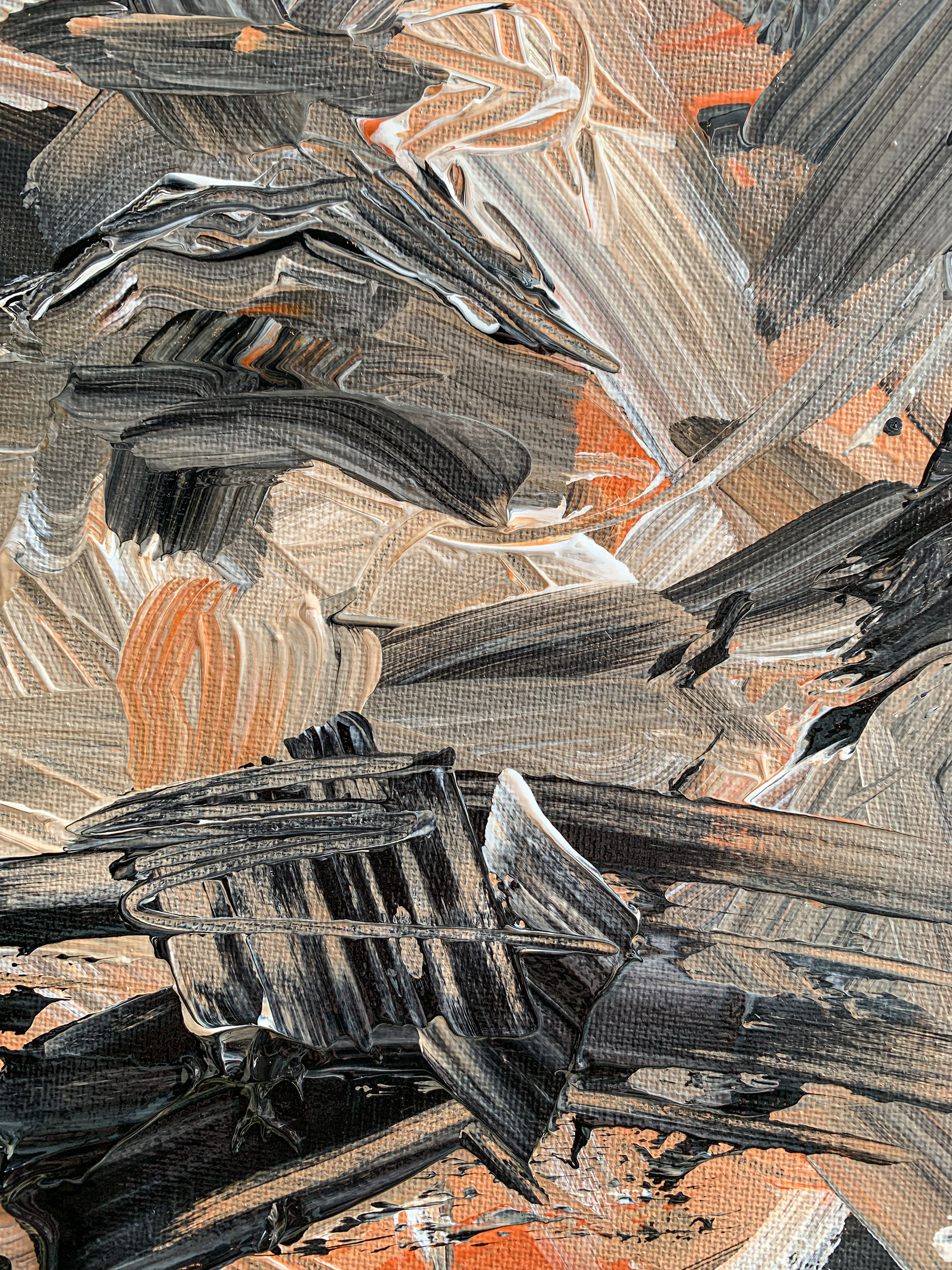The black and white check is a method for me to check my contrast and form. Contrast is what makes it easy for the eye to pick out a subject from the background. Distinguishing a good foreground, mid-ground, and background brings depth to a painting. But sometimes you don't want that. This this painting I wanted it to look like there was a face hidden in the secrets of the abstract piece.